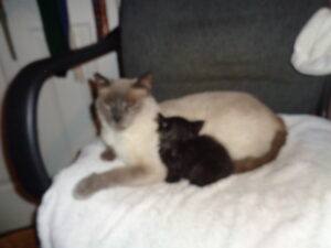 On January 26, 2023 Chris was fit enough to be spayed. Dr. Seeley examined her colon during this surgery. Possible surgery to repair her colon has been ruled out. Chris is now eliminating normally, most of the time, with the help of laxatives. She is a wild girl, racing around the house, playing with her toys, and cuddling with me when she slows down. She loves her “Big Boys”, Milo (age 14) and Simonelli (age 15), getting them to chase and play with her. They curl up together and groom each other.